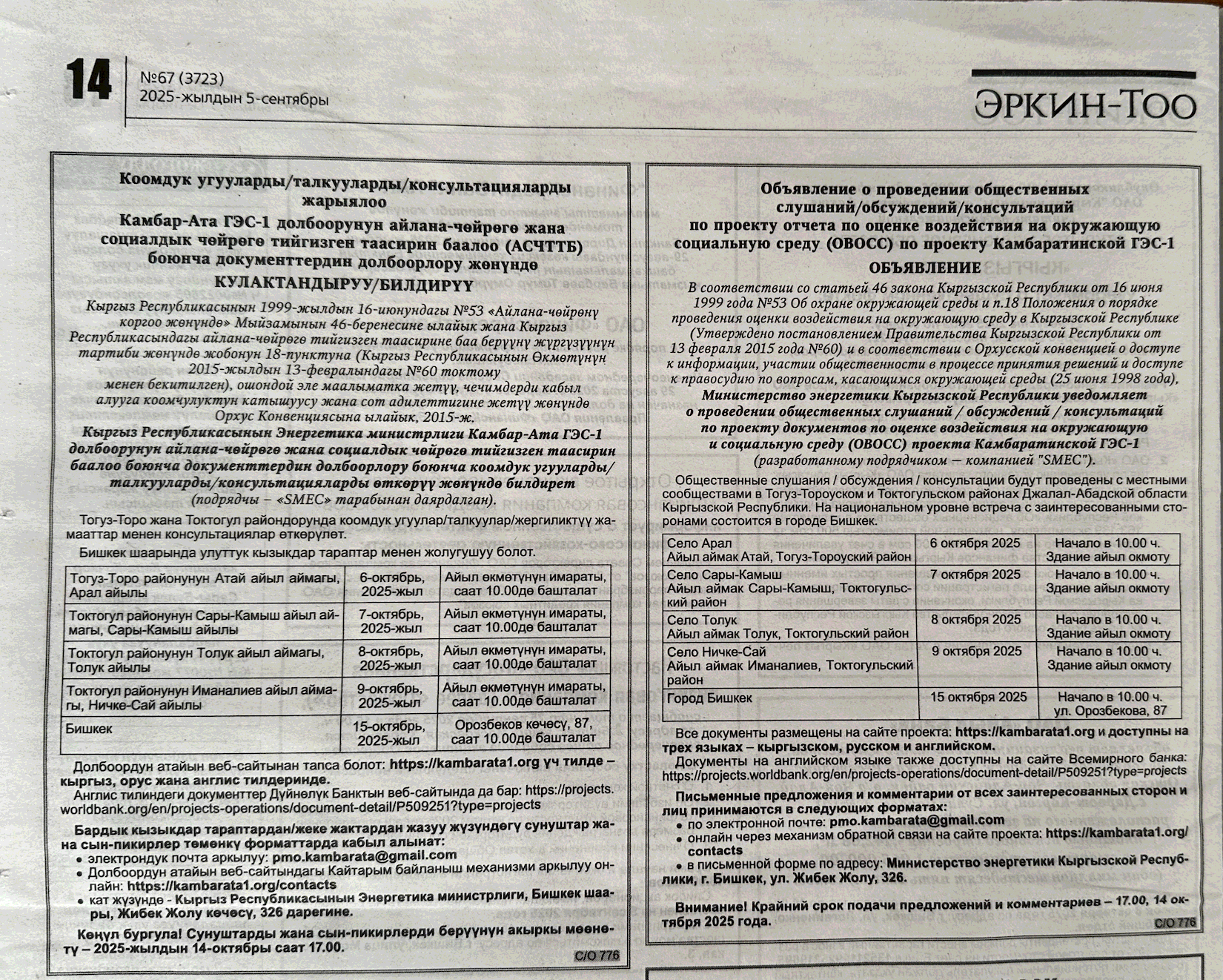 In accordance with Article 46 of the Law of the Kyrgyz Republic dated June 16, 1999 No. 53 On Environmental Protection and paragraph 18 of the Regulation on the procedure for conducting environmental impact assessment in the Kyrgyz Republic (Approved by the Resolution of the Government of the Kyrgyz Republic dated February 13, 2015 No. 60 ), and in line with the Aarhus Convention on Access to Information, Public Participation in Decision-Making and Access to Justice In Environmental Matters (25 June, 1998), the Ministry of Energy of the Kyrgyz Republic notifies about public hearings / discussions / consultations on the draft environmental and social impact assessment documents for the Kambarata HPP-1 project (prepared by contractor - "SMEC").